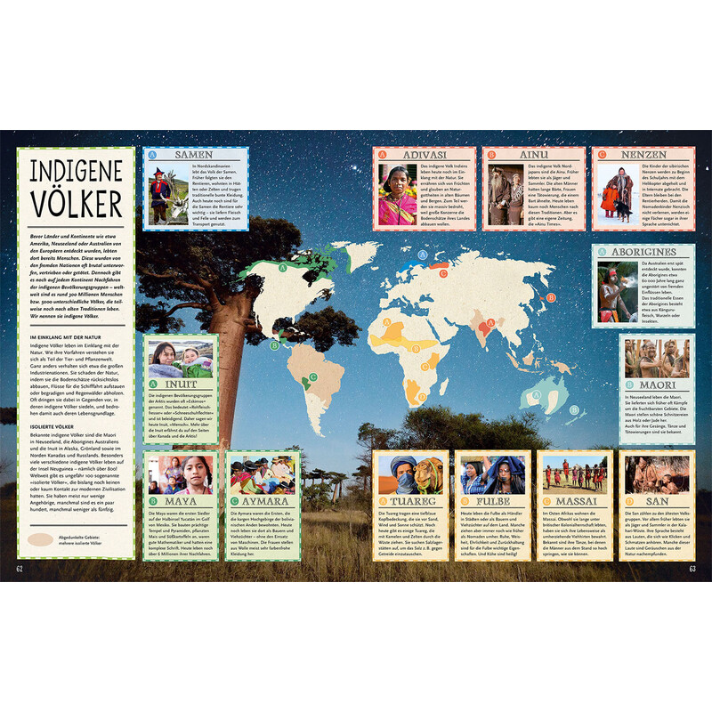 Den Weltatlas aufklappen und schon beginnt eine spannende Reise rund um die Erde. Welche Tiere leben in Asien? In welchem Land wachsen exotische Pflanzen? Wo findet man die Weltwunder? Auf tollen Karten werden die Kontinente und ihre Bewohner, die Pflanzen- und Tierwelt vorgestellt. Indigene Völker, Europapolitik, Vulkane, Klima: Schwerpunkt- und Übersichtsseiten liefern spannende Zusatzinformationen zu besonderen Themen. Auf mehr als 400 Farbfotos und 300 Zeichnungen die Welt, Rekorde, Verrücktes und Besonderheiten entdecken. Der Weltatlas liefert Informationen für die Vorbereitung auf Referate. Mit einer Weltkarte zum Aufhängen.