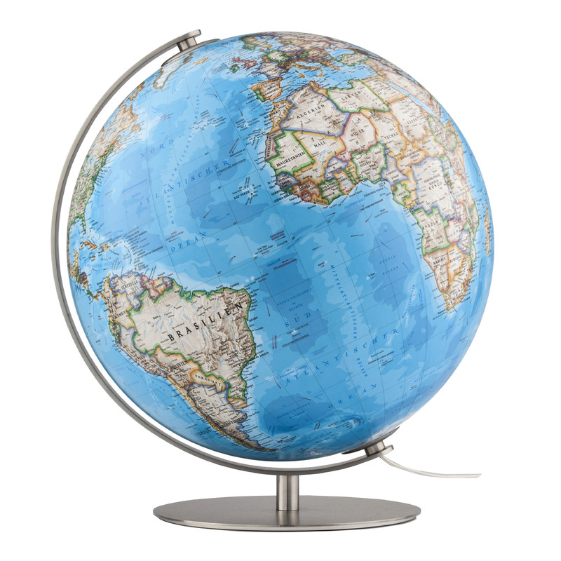 Die Globuskugel zeigt die Kartografie "Classic" der National Geographic Maps Division. Diese Kartografie ist im Wesentlichen politisch, physische Informationen sind durch Schattierungen angedeutet.
