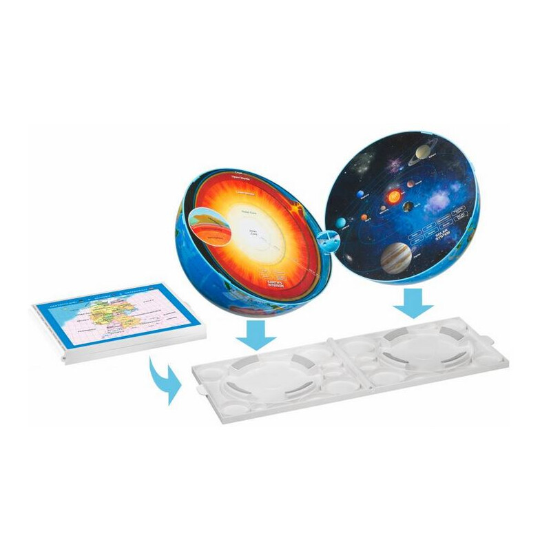 Der Globus, aus seiner Halterung heraus genommen und aufgeklappt, liefert zudem noch Spannendes und Wissenswertes über das Erdinnere und unser Sonnensystem.