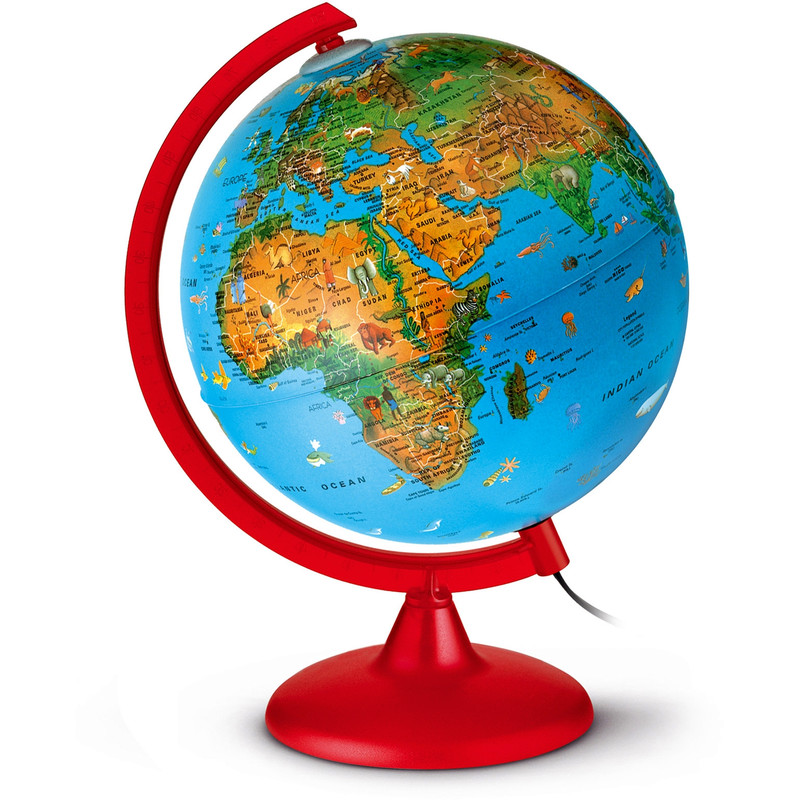 Der Globus KR 2562 eröffnet bereits unseren Jüngsten die Möglichkeit, erste geographische Zusammenhänge zu verstehen. Ausgestattet mit einem roten Kunststoffgestell, zeigt eine Vielzahl von Informationen über Tiere und Bauwerke unseres Planeten. Die Darstellung ist bewusst illustrativ und kindlich gehalten. Natürlich dient dieser Kinderglobus auch als eine ideale Kinderzimmer- oder Gute-Nacht-Beleuchtung.