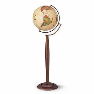 Dieser Standglobus hat einen Kugeldurchmesser von 37 cm und ist mit einem dreh- und schwenkbaren Holzmeridian ausgestattet. Die Gesamthöhe beträgt 105 cm. Der Fuß und die Säule bestehen aus walnussfarbigem Naturholz. Aufgrund seines geringen Platzbedarfs eignet sich dieser eher schlicht wirkende Standglobus auch für kleinere Räume.