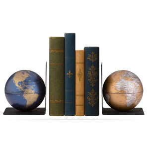 Zwei elegante Buchstützen aus Metall mit Globen vereinen Funktionalität und Entdeckergeist.