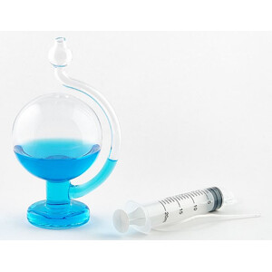 Steigt der Luftdruck, wird die Luftblase in der Barometerkugel zusammengedrückt, und das verändert den Wasserstand: In der Kugel steigt er, im Hals fällt er. Da sich im Hals nur relativ wenig Wasser befindet, macht sich das Steigen und Fallen des Wasserpegels hier besonders stark bemerkbar.