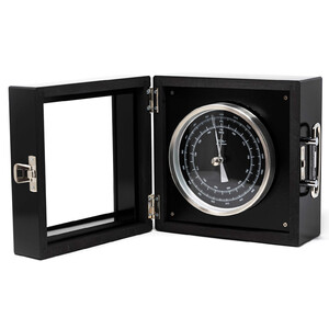 Inspiriert von Marine Chronometern, welche zum obligaten Inventar der Schiffsbrücke gehören, hat FISCHER in 2024 eine limitierte »Black Edition« des Präzisions-Aneroidbarometers geschaffen, welche mit dem schwarz lackierten Massivholz-Gehäuse eine besonders edle Optik aufweist. Auch das Zifferblatt des Instruments wurde in Schwarz gehalten, die Lünette besteht aus gebürstetem Edelstahl. Der doppelschneidige Index-Zeiger im Deckglas ermöglicht eine parallaxefreie Ablesung des Messwertes.