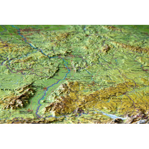 Echt 3D Reliefkarte der Deutschland mit einer Reliefschummerung und farbigen Höhenschichten welche aus hochaufgelösten Geländemodellen abgeleitet werden. Es wurde versucht, die detailtreue eines Luftbildes für den Betrachter graphisch aufzubereiten.