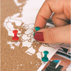 Diese Weltkarte aus Kork ist ideal dazu geeignet, die nächste Reisen zu planen oder an besuchte Reiseziele zu erinnern.